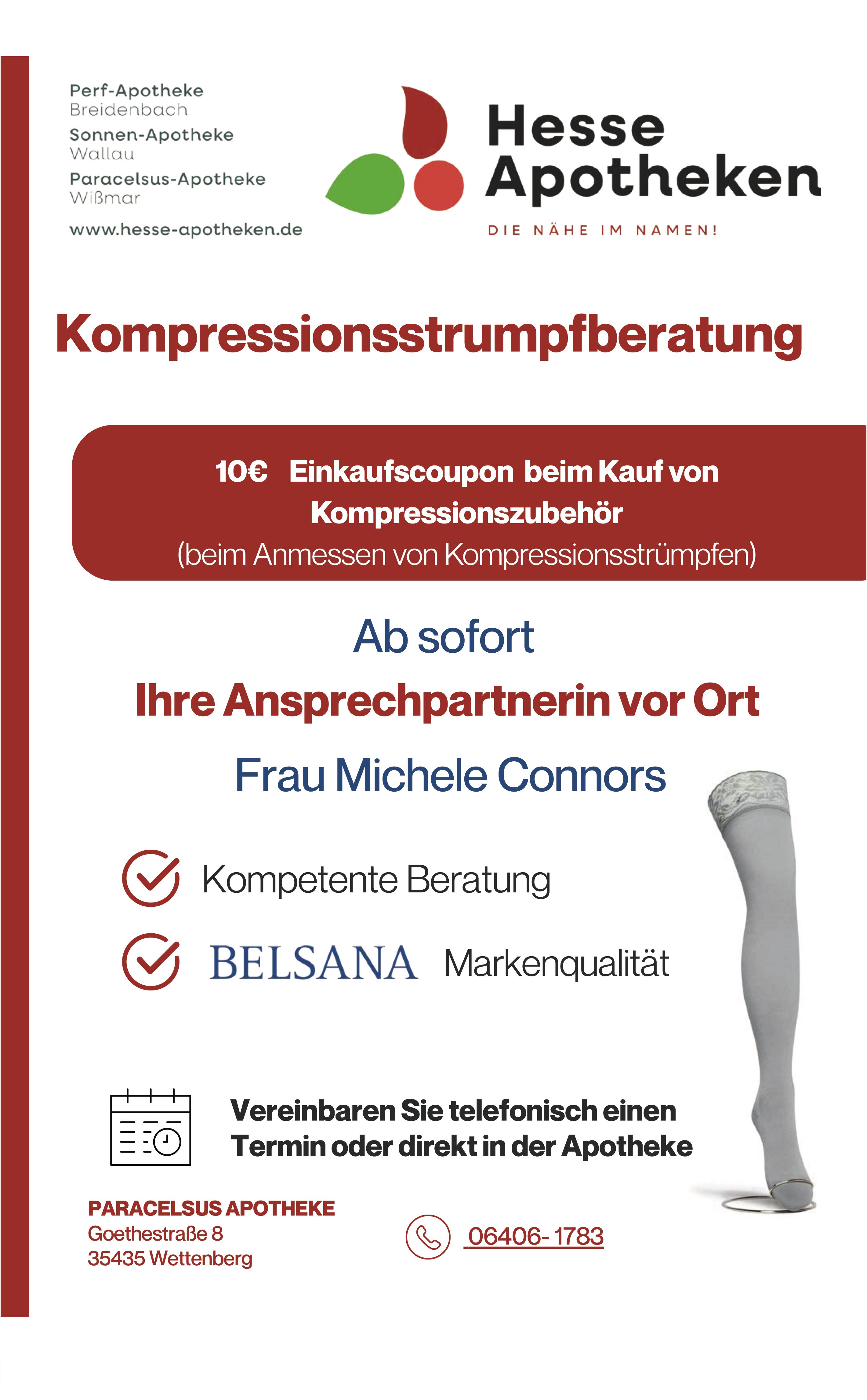Als zertifiziertes VenenFachCenter der Firma Belsana beraten wir Sie umfassend dazu und messen Ihre Beine für eine perfekte Passform individuell aus. Durch ständige Fort- und Weiterbildung in diesem Bereich bieten wir einen zuverlässigen Rundumservice mit Beratung, Anmessen und individueller Produktauswahl.